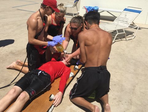 For homework, students present a safety topic during a staff training at their home pool and run an emergency action plan scenario to practice leading other lifeguards and providing feedback.