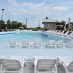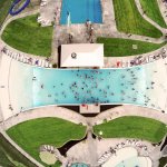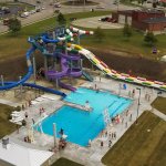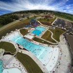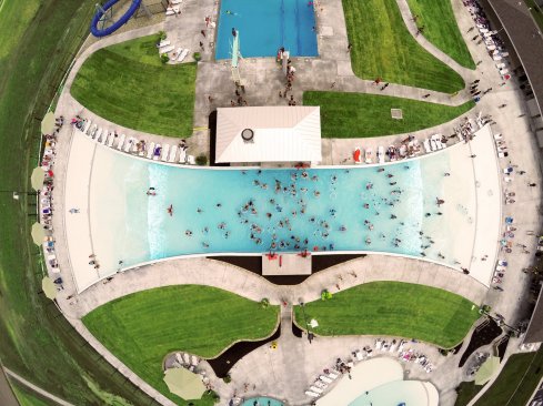 The park also features a rectangular pool with lap lanes, racer slide, speed slide, open flume slides, zip line, 3-meter dive stand and climbing wall. On the other side of the wave pool, a network of circles houses a vortex pool, zero-depth area with interactive play structure and a shallow sport pool.