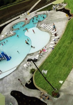 The long, narrow bow tie could fit in the space allotted on a single elevation. Measuring 206 feet long and graduating in width from 30 to 80 feet, it was a departure from the normal wide and short wave pool. At its deepest point, in the center, visitors can stand in 4½ feet of water.