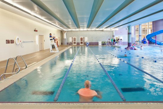 Rockwork accents and waterfalls were placed throughout the facility to evoke a luxury destination and push the design envelope for municipal recreation centers. Generous light reinforces this vibe. To promote this effect, the gym was placed on the upper floor, above the lap pool, to look down on the leisure pool. This creates a more expansive feeling in both spaces and allows plenty of light in from the gym. Large windows on the other side of the building flood the space with natural light.