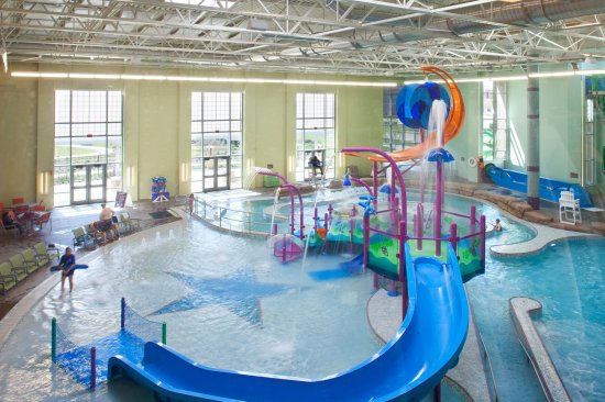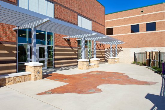 The facility offers many tips of the hat to its location. To honor Texas, rows of lone stars serve as lane markers in the floor of the lap pool, and the zero-depth-entry area features a large blue star. An outdoor spraypad was formed in the shape of the state, with spray nozzles marking each major city. Grapevine receives its tributes, too. The two-story indoor-outdoor slides come in green to represent vines, and purple to evoke grapes. Clusters of grapes and trees float in the center of the activity pool. Knowing that the aquatics center would experience high traffic, the designers spread out the major features to reduce competition for space. The components used most for exercise —the lap pool and current channel — are placed at opposite ends of the building to spread out the swimmers and resistance walkers, and open up the middle of the natatorium.