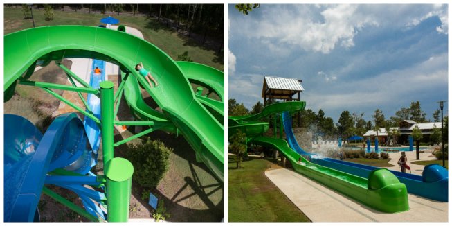 Two water slides — one dropping a straight 25 feet, the other twisting down — appeal to the more adventurous in the neighborhood. The blue and green colors help blend with the water, lawn and forest beyond.
