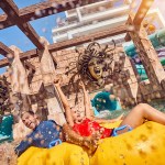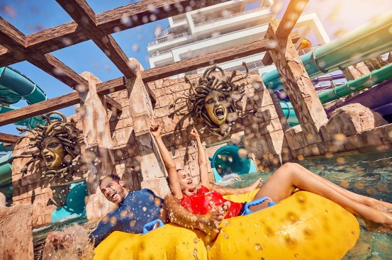 The design and theming are meant to reflect the environs, with the structures crafted to look as if they had risen from the seafloor and onto the palm-shaped, man-made island. Corals and aquas combine the aquatic with desert. On the stone work in Immortal Falls Cliff Jump and Trident Tower, visitors see what appear to be etchings from a lost, ancient civilization. Splasher’s Cove includes aquatic flooring that looks like ocean waves approaching the children’s slides. Medusa’s Lair, with its racing tube slides, features imagery of the mythological figure to add to the overall theme.
