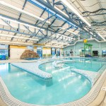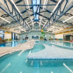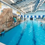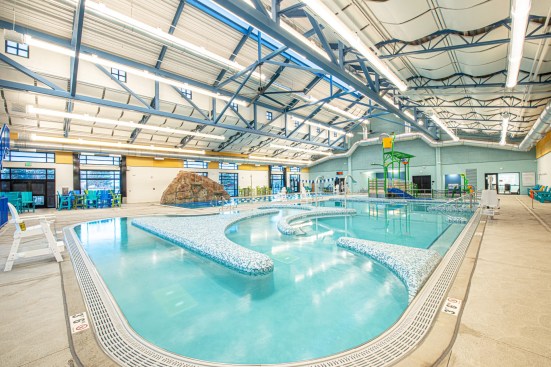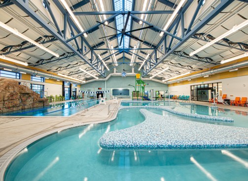 On the usability side, multiple features bridge the generation gap, including a lazy river, two-story water slide, large hot tub/spa, three-lane lap pool, lifestyle pool, play equipment with water features, wet climbing wall and diving platform. An oversized hot tub appeals to adults, especially seniors looking for therapy. A child’s play area entertains little ones with miniature slides, sensory water features and a large spilling bucket.