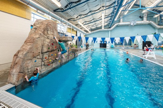 For older children and teens, the team included an interactive area, a two-story slide with a timer to spur friendly competition. A wet rock wall and two diving wells were included in the three-lane lap pool. The rock motif further ties in with the facility’s theme.