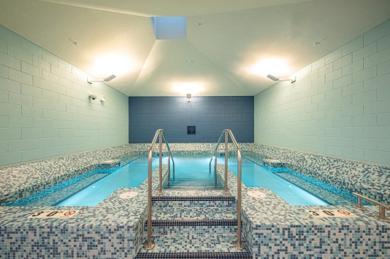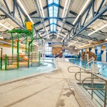 Vertical pumps on the activity pool reduce the project’s footprint. Wall-mounted instantaneous heaters for the pool water achieve the same goal and, by using multiple smaller heaters rather than one or two large boilers, operators can restrict energy use only to what’s needed. An advanced nanobubble technololgy introduces more oxygen into the water, for a reduction in needed chemicals and maintenance.