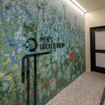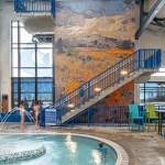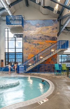 The view of nearby Rock Mountain National Park provided plenty of inspiration. While researching the area, the team found a watercolor of Longs Peak by William Henry Holmes, created in 1874 and housed in the Smithsonian. They retained rights to recreate the image in a two-story glass-tile mosaic on one of the stairwells. Another mosaic was placed at the locker-room entrance.
