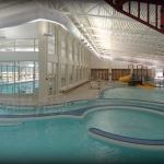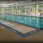 Inside, the two pools are separated by glass walls, reducing noise while creating a feeling of open space and allowing daylight to filter through. The glass walls also provide views of the trees and adjacent nature trails.