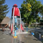 To honor the park’s namesake, the design team chose a space and exploration theme, which offered the added benefit of educating the community. This is reinforced, for instance, in a splash pad with interactive water features that include a large water dumping rocket. The space theme also found its way into the bathhouse architecture. Metal privacy panels feature constellations carved out with backlighting, and overhead light fixtures form sunbursts.