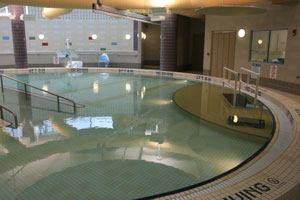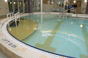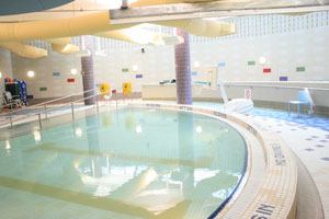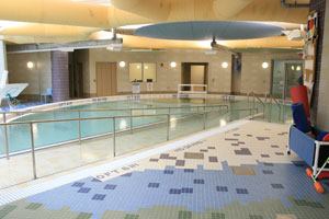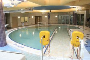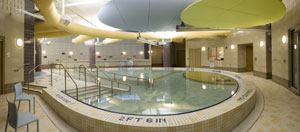 Aquatic designers Counsilman-Hunsaker and architects HKS, Inc. designed the natatorium with an 800-square-foot, shallow-water, slip-resistant therapy pool, a ceiling track patient lift system, ramp entry, and an underwater bench shelf. In addition to a programmable chemical automation system, the pool water is routinely monitored and treated by UV sterilization to kill bacteria, viruses and mold spores and continuously remove chloramines. Parents can view their child’s therapy session while waiting directly on the pool deck or from a vestibule area that looks into the pool.
