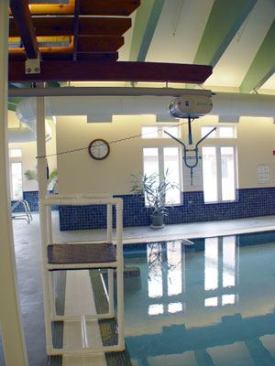 Several therapeutic and design elements further aid in the rehabilitative capabilities of the facility. Perhaps most notably, for those unable to enter the water using ramps or stairs a handicap chair lift, supported by an eye-appealing redwood arbor, is located between the two pools. In addition, unique individual unisex changing rooms offer the privacy of a complete bath with no-step showers and adequate space for assistance.