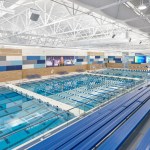 Anchoring the facility is the Lilly King Competition Pool, named after the Olympic gold-medalist swimmer and town native. Built to accommodate local high-school and collegiate swim meets, the stretch 50-meter pool allows swimming and diving to occur simultaneously, with 10 lap lanes and two bulkheads to divide it into multiple configurations. A separate diving well has 1- and 3-meter springboards and practice entry harnesses. A state-of-the-art timing system and two large monitors and on-deck showers support the meets. A custom mural depicts the pool’s namesake.
