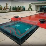 At the center of the deck is a reflecting pool finished in garnet red, glass mosaic tile, with a raised 4-inch black granite infinity edge. Positioned to mirror the St. Louis Gateway Arch, the fountain’s attached whirlpool spa is separated by a glass partition and flanked by raised water bowl fountains that cascade into the spa.