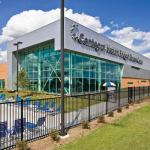 The 119,000-square-foot fitness and physical rehabilitation center is centered around an exterior courtyard and includes a physical therapy space, jogging track, group exercise rooms, indoor tennis courts and a workout area. Around the facility’s exterior, glass is used in priority areas to take advantage of views either into or from the center in the form of skylights, clerestory windows and walls of glass.