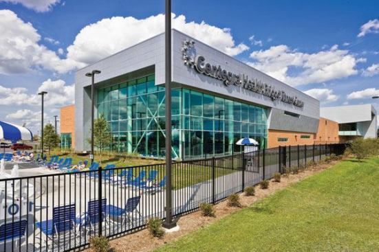 Among the outdoor aquatic amenities are a 6,800-square-foot family leisure pool with zero-depth entry. Its interactive children’s play feature is designed especially for climbing, crawling and sliding; an almost silent vortex; a current channel that provides a water walking opportunity (with or against the current); and a slide. The center also offers a physical therapy area. And an extensive green roof system over the lower one-story structure to the west provides environmental and aesthetic benefits.