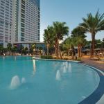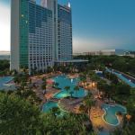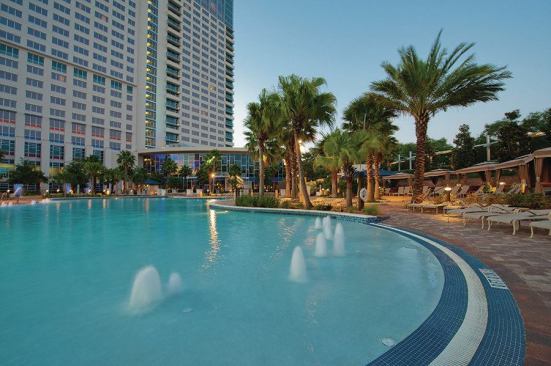 Formerly the Peabody Hotel, the upscale Hyatt Regency Orlando underwent a significant expansion, including the addition of a tower. The multifeatured aquatic area was meant to entertain tourists, as well as serve businesspeople in need of relaxation after a day at the convention center across the street. In addition to the outdoor pools, fountains at the hotel and convention center entrances feature a multiple-weir design to reflect the architecture of the new hotel tower. All waterfeatures have LED lighting and programmable show fountain elements.