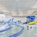 Also inside: a 371-square-foot therapy pool with custom grab rails and benches, ensuring accessibility and comfort. Textured precast panels and extensive glazing create a contemporary vibe, maximizing natural light and views of the outdoors. The facility’s design also incorporates contemporary artwork and modern play structures.