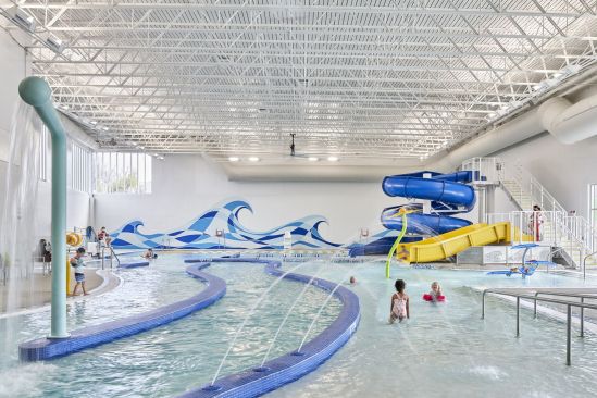 The indoor facility features both a leisure and lap pool. Four 25-yard lanes accommodate lap swimming, while a lazy river, and two slides — a closed-flume body slide and a ramp slide — offer more leisurely pursuits.