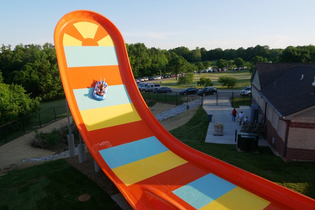For the color scheme, the designers selectively chose hues that would blend and contrast with the environment. The natural blues and greens of the shade canopies visually connect with the pool water and landscape, while vibrantly colored water slide flumes and play structures provide pops of color.