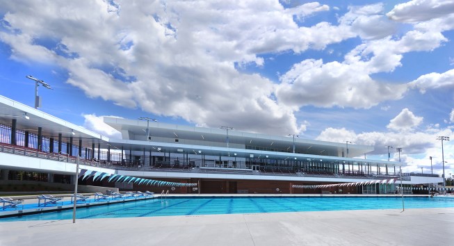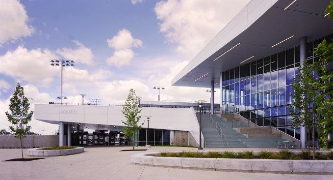 The pools were designed for flexibility. The 59-meter, all-deep competition pool has two movable bulkheads so operators can reconfigure the space into multiple zones. The 30-meter shallow-to-deep teaching and diving pool includes a movable bulkhead for flexible programming. It also features two 1-meter and two 3-meter competition diving boards and a heated therapy pool. Grandstand seating can accommodate more than 2,000, and plenty of deck and lawn space allows that number to expand.