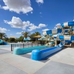 Blues, greens and tans were used on the pools and slides to enhance the tropical vacation theme. Exotic plants such as palm trees, along with rich building materials such as stone and colored concrete, reinforce the resort vibe.