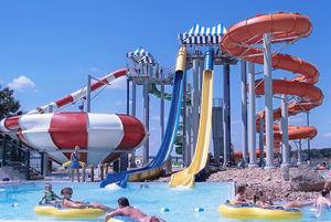The themes are easily managed through Web-based software that keeps track of which ones are most popular and how many riders the slide had for the day. The waterpark operator can change the water slide themes as easily as the click of a mouse and add themes for special occasions or holidays such as the 4th of July. The slide complex has a total of five large water slides. The lazy river completes the outdoor pool area as it winds around the base of the water-slide complex.