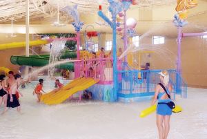 The indoor waterpark offers a trio of large water slides, the most popular being the enclosed raft slide that winds its way outside and back inside using the same theme-ride technology as the outdoor slide complex. The indoor facility features a rock-climbing wall, relaxation pool with spray jets, and water basketball along with its own lazy river.