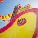 Daredevil’s Peak was meant to be seen from miles offshore, so cladding around the slide boasts vibrant colors. Working within the Royal Caribbean palette, designers gave each slide its own hue to distinguish it from its neighbors. Caribbean theming on the wave pool includes starfish, seashells and water-droplet shapes.