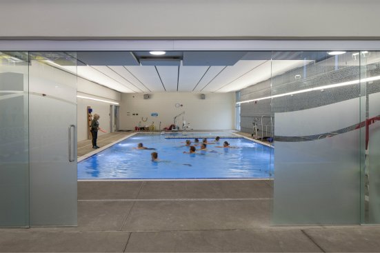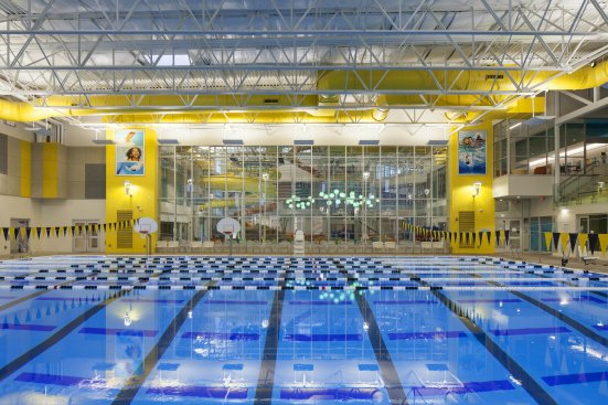 This completely engaging experience is unique to the leisure pool. Two other areas were designed with their own specialized atmosphere. The competition pool, meant for world-class meets, takes on a more serious air. The therapy pool space, features a significant lower ceiling with special acoustic panels to help those with impairments to work out without a hearing aid. Soothing colors create a comfortable environment for those seeking therapy. A special door allows access to the family lockers, to minimize walking and maximize privacy.