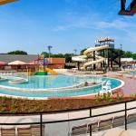 Dream amenities: A 4-lane lap pool cascading across a wet deck into a leisure pool with zero-beach entry, a current channel, climbing wall, central water slide, and tot pool, all surrounded by terraced deck areas.