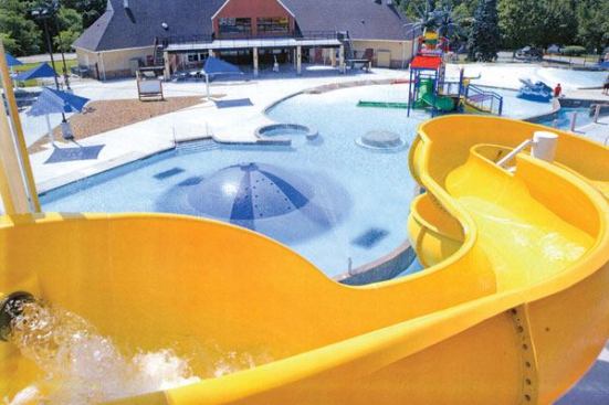Joyful squeals abound when the large bucket of water topples from the participatory play feature, essentially a multi-level interactive water play structure for children for climbing, crawling, operating valves and sprays, and just their size waterslides. Two giant waterslides keep bigger kids and even bigger adult “kids” climbing and plunging into the water for hours of cool entertainment fitness. Not to be outdone, a 1,300 sq. ft. wading pool includes an exotic waterfall backdrop. On the periphery, adults stretch out on Caribbean blue lounge chairs while parents help their little ones become acquainted with aquatics by using a zero point of entry into the pool for safety (also safe for populations requiring accessibility). The tot pool offers gentle spray features and a baby shark slide for Hazelwood’s tiniest guests.