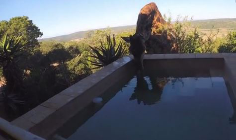 It’s not every day we see a giraffe drinking from a swimming pool. But a couple vacationing in South Africa captured the rare event on film when this wild giraffe began drinking from their room’s private, elevated swimming pool.
