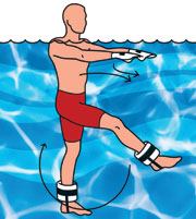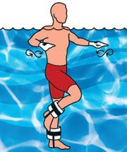 The two deep-water exercises illustrated here use a familiar and simple physical activity, bicycling, and make it more complex by involving multiple muscle synergies in varying proportions. The first level of synergy involves a bicycling motion with a single leg while maintaining the alternate leg firm and stable. The next level of synergy involves directionality — the single-leg bicycle action is performed in reverse direction.