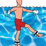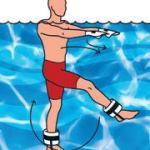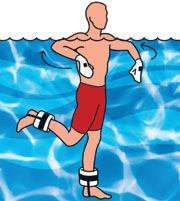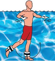 In both exercises the arms perform a bilateral pattern, sweeping forward or backward to assist movement while the legs continue to perform a unilateral bicycle pattern. All of this is coordinated while maintaining the body in an upright position and moving through the water — a very complex set of moves.