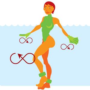 LEG SWING Maintaining a neutral spine and pelvis, stand upright and shift your weight to support yourself on your right leg. Keeping your right knee slightly bent, swing your left leg forward and back staying balanced and supported on your right leg. Engage your arms and activate your hands to scoop water forward and to press water back. Repeat the alternating arm and leg action, maintaining balance and support on your right leg. The coordinated arm and leg action, one in opposition to the other, lends dynamic balance and stability to the exercise. After 8-10 repetitions, repeat the exercise standing on your left leg for support.