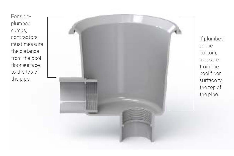 In the standard, “sump depth” does not refer to the depth of the physical sump below the cover. Instead, this means the distance from the surface of the pool floor to the point of first contact with the pipe. If the plumbing runs vertically from the bottom of the drain, this measurement would go from the pool floor surface to the pipe opening. If the pipe enters horizontally on the side of the drain, the measurement would go from the pool-floor surface to the closest side of the pipe.