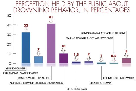 The respondents also were shown a list of behaviors and asked to identify which ones most realistically represented a drowning. Most of the behaviors given were ones commonly dramatized in movies and television, but do not actually occur in active drowning episodes.