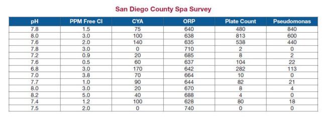 The chart above shows data from a non-empirical study completed some 20 years ago by a San Diego County health inspector of hotel spas. Examine the various ppm and pH values that meet code. Then look at the plate count and pseudomonas levels. Here, the culprit is CYA in affecting (or not) the destruction of pathogens. Now, examine the same plate count and pseudomonas levels by examining the ORP. In every instance, ORP values above 650 millivolts result in far more favorable pathogen destruction.