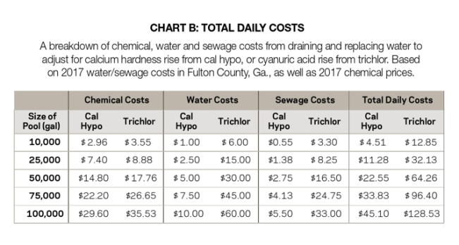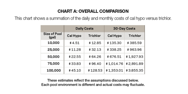 To compare the costs of using cal hypo with those of using trichlor, an estimate was made based on 2017 water and sewage rates in Fulton County, Ga., combined with 2017 chemical costs. This estimate shows that costs incurred by facilities using cal hypo might be considerably lower than those for the same facility using trichlor. Chart A shows estimated costs when adding 10 parts per million of available chlorine to a pool using the two sanitizers. An explanation of the assumptions used for the estimate follows.