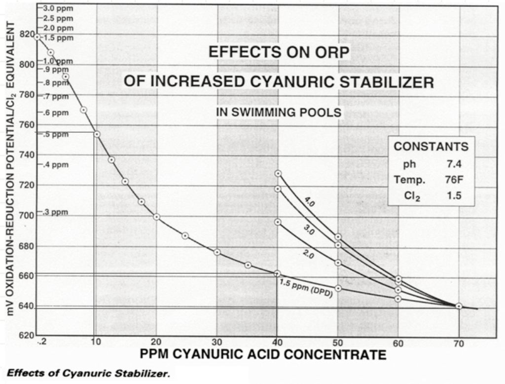 Second, let’s examine the effects of CYA on oxidation. This graph illustrates the dramatic effect of CYA on the oxidation process. Examine the actual oxidation reduction potential (a millivolt measurement of the water’s ability to oxidize, often referred to as the “work value” of the chlorine), and the corresponding ppm (the quantitative or how-much measurement) equivalent. With zero CYA, at a ppm residual of 1.5 ppm, the ORP is near 820. Yet, with only 10 ppm of CYA, the ORP drops to 755 mV with an equivalent ppm “work value” of just over 0.5 ppm. At a 40 ppm CYA concentration, the ORP drops to just over 660 mV (which is just barely over the World Health Organization’s ORP minimum of 650 mV for tolerable disinfection) and the equivalent ppm work value of around 0.25.
