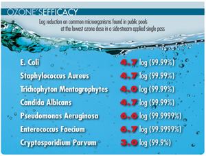 Ozone is a safe and efficacious antimicrobial oxidizer. In public recreational water, it is used in conjunction with chlorine. Pool water clarity and quality is improved because of ozone’s potent and rapid oxidation of organic and inorganic compounds. Ozone is cost-effective, uses little energy, is safe for pool patrons and will not cause structural degradation to the facility or HVAC system.