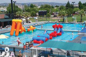 A couple of years ago while attending a trade show, I picked up a brochure advertising some very large inflatables that looked as if they would be a fun addition. With the support of our department heads, the decision was made to move forward with the purchase of three of these large inflatables to create the “Folsom Aquatic Center Megaplex of Fun.” Along with the purchase of the three inflatables, we decided to buy two portable deck slides and a climbing wall that will debut in 2010.
