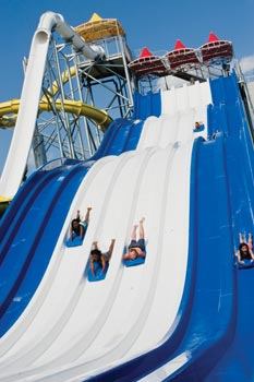The tropically themed waterpark, developed by Village Vacances Valcartier Group, spans 100-plus acres and includes more than 35 water slides and 100 water games. It also features a wide range of entertainment options, two international-level beach volleyball courts and ample green space.