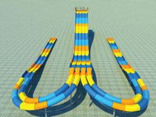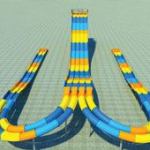 SplashRally stands six stories tall and the design is carefully engineered to ensure all six lanes are equal in length,while adding the thrill of banked turns and tubes passing each other. Riders begin at a “starting gate,” with a mechanically controlled start. Once the race commences, all guests are sprayed by the first of two strategically placed water cannons as they descend the 604-foot track. As the race nears its finish, everyone except the winning rider is deluged by the last water cannon before ending in an 8-inch-deep run-out. As riders exit, they can check their final race times, displayed on time clocks located above each lane.