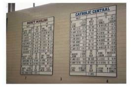 For over 30 years, Grid Concepts has been providing colleges, high schools, and clubs with custom record boards of the highest quality. All of our boards are customized for our unique customer’s needs. Our boards include panels with adhesive lettering that doesn’t have to slide or snap into place. In addition, school colors are included in the design of each board, along with logos, and with pre-applied lettering on the “T” panels. We can also add athlete’s names to the boards for a more personalized look and a front-loading display frame. If you have an existing board from Grid Concepts, we can create add-on sections for it at a later date. Designed by coaches, our record board systems offer the convenience, look, and quality you need to record your events, all at a competitive price. Let us help you create a competitive atmosphere, where records are made to be broken, with our record boards. Grid Concepts: the record board that motivates and recognizes athletes.