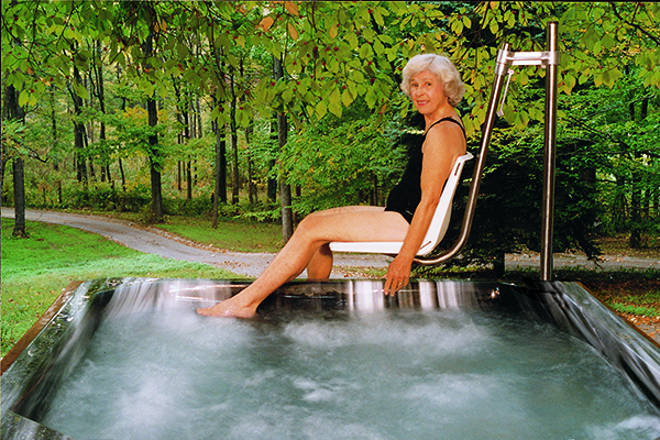 Water-powered, 300 lb capacity. Mounts to wood or cement deck or wood post in ground. Manual seat turn. Choice of seat orientation. Vertical travel 31”.