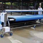 RenoSys : The new Infinity Membrane from RenoSys is a completely… RenoSys : The new Infinity Membrane from RenoSys is a completely colorfast, commercial, reinforced PVC pool membrane designed to be highly resistant to plasticizer migration, and will remain colorfast and last longer than standard PVC formulations, according to manufacturer. It also is virtually impervious to the effects of UV and chlorine. Shown in photo: Side-by-side samples demonstrate the effect of high levels of chlorine immersion on Infinity (bottom) and a competitor’s product (top) for 24 hours, simulating several years of normal exposure. Contact: 800.783.7005; renosys.com