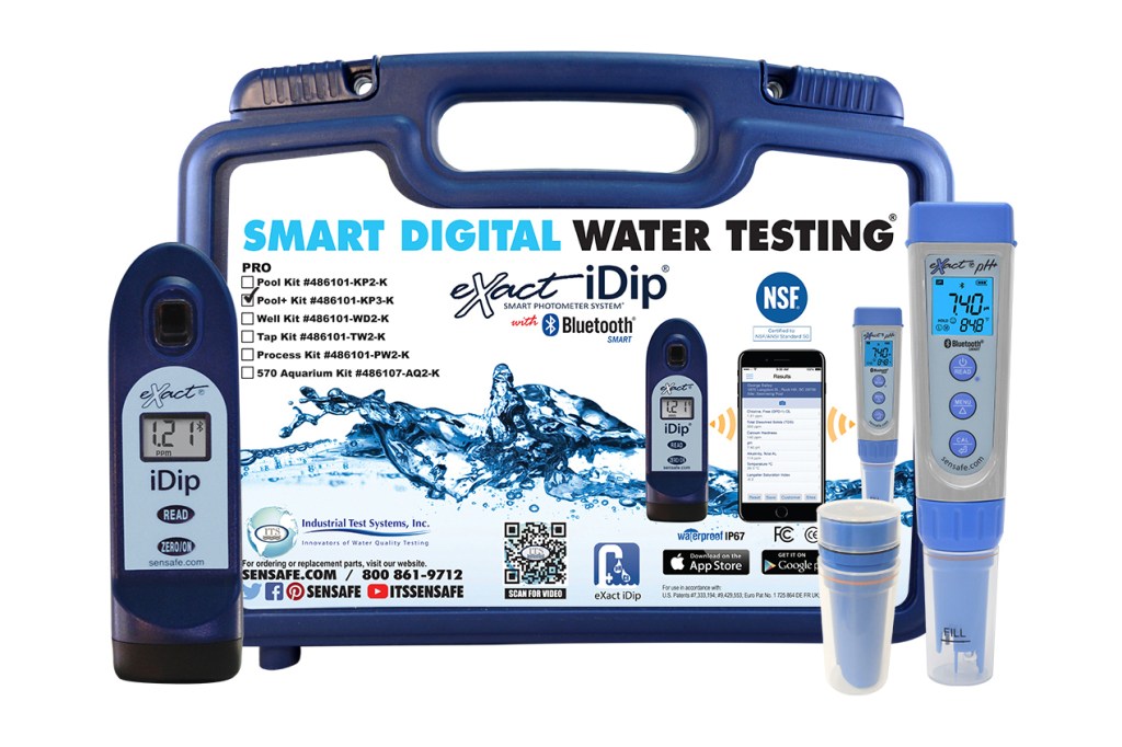 The eXact iDip Pool Pro+ Test Kit includes are the Level 1 NSF/ANSI-50 Certified eXact iDip Smart Photometer System; the new eXact pH+ Smart Meter System, which uses electrochemistry technology combined with Bluetooth connectivity; and the ORP Probe.