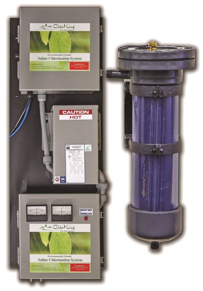 ChlorKing Inc. makes salt chlorination systems that can be used on pools of any size. The company’s commercial saline chlorination systems (shown) employ single-cell technology, meaning there is no banking of multiple residential cells on one pool. The water-cooled power supply is suitable for use in extreme environments, and saturated salt feeders control the salt level in the pool, eliminating the need to add salt to the water manually. This product line is known for its ease of use and reliability. Contact: 800.536.8180; chlorking.com