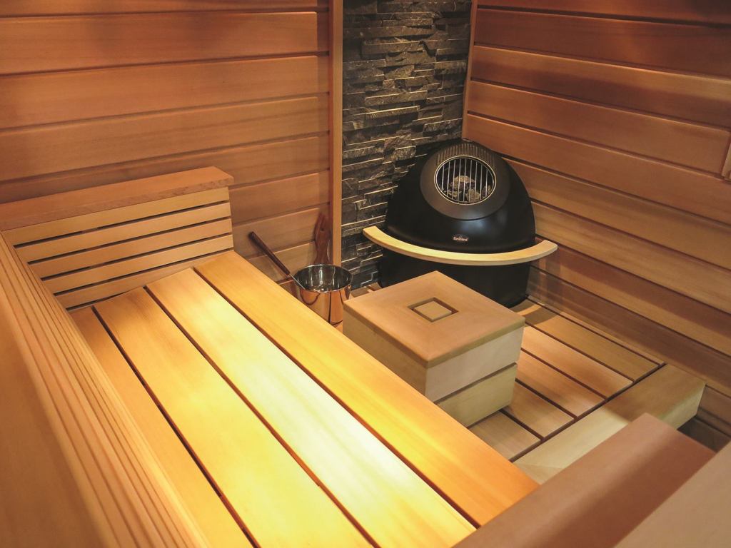 The Seaside, Finnleo’s newest addition to its Designer Series saunas, recreates the feel of sitting “seaside” and relaxing on a comfortable reclining bench or chair. Features include a comfortable, tapered bench design, wide board T&G and an optional rock wall section. The Seaside also is available as a deluxe interior on any Finnleo custom sauna. Contact: 800.346.6536; finnleo.com